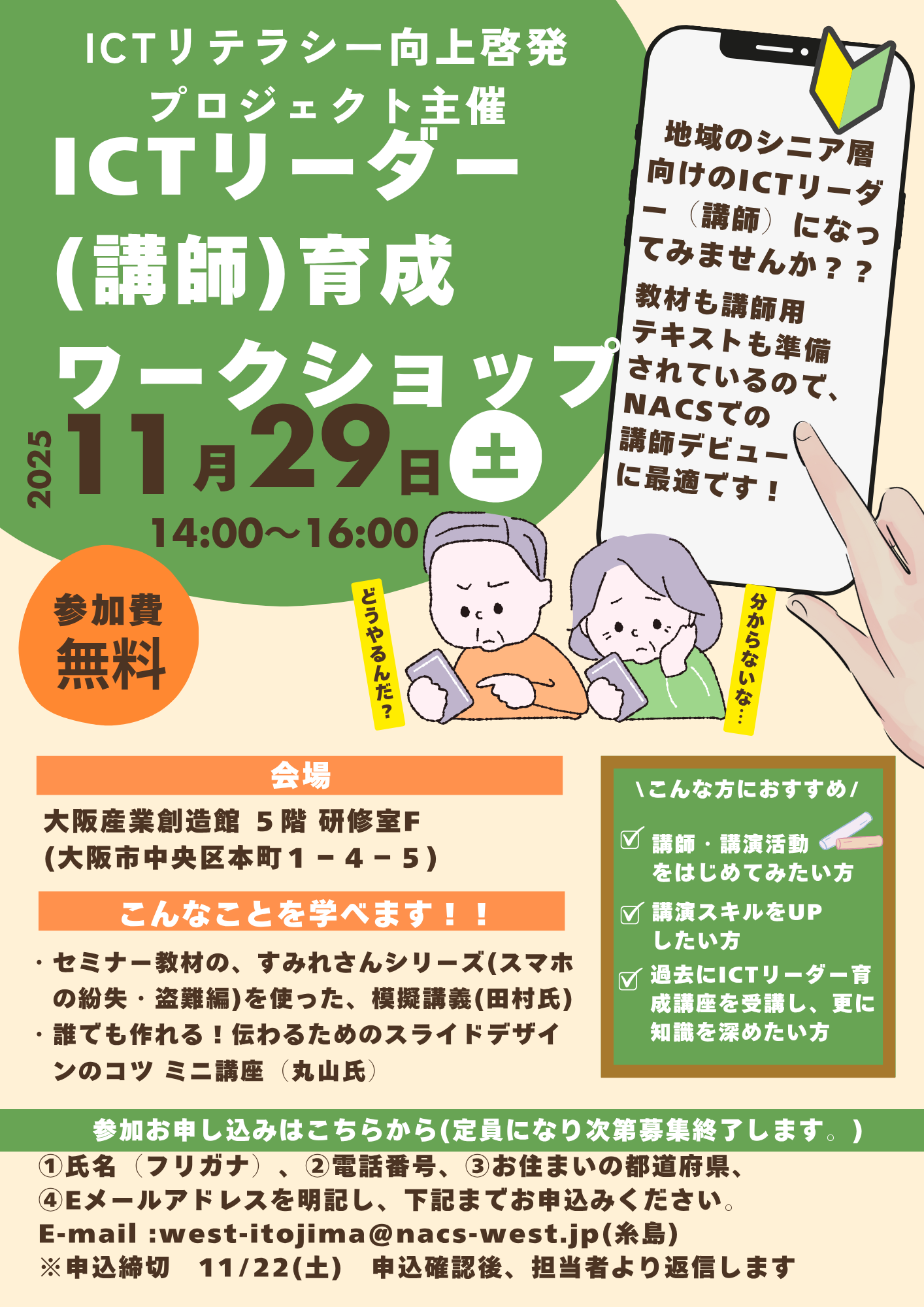 6.申込:①氏名(フリガナ)、②電話番号、③お住まいの都道府県、④Eメールアドレスを明記し、右記までお申込みください。E-mail :west-itojima@nacs-west.jp(糸島)